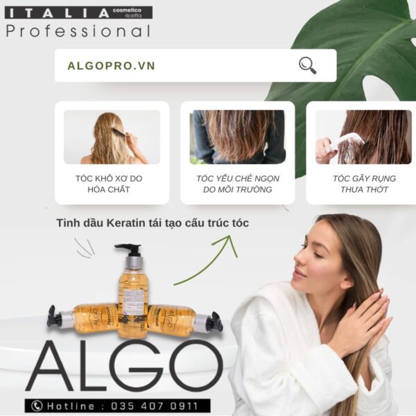 “ALGO PROFESSIONAL là thương hiệu chăm sóc tóc với công nghệ Ý gia công tại Việt Nam. Các dòng sản phẩm của ALGO đều tập trung vào việc phục hồi và trị liệu những mái tóc hư tổn. Một mái tóc đẹp sẽ là “vũ khí tối thượng” giúp khách hàng đặc biệt là chị em phụ nữ trở nên tự tin và xinh đẹp hơn.